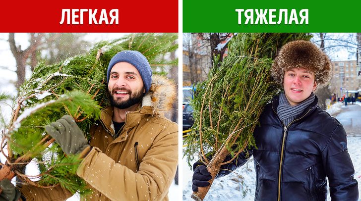 не будет легким. Оптимальный вес средней елки — 5–7 кг. Если дерево слишком легкое, то, скорее всего, оно болеет и уже начался процесс быстрого высыхания;