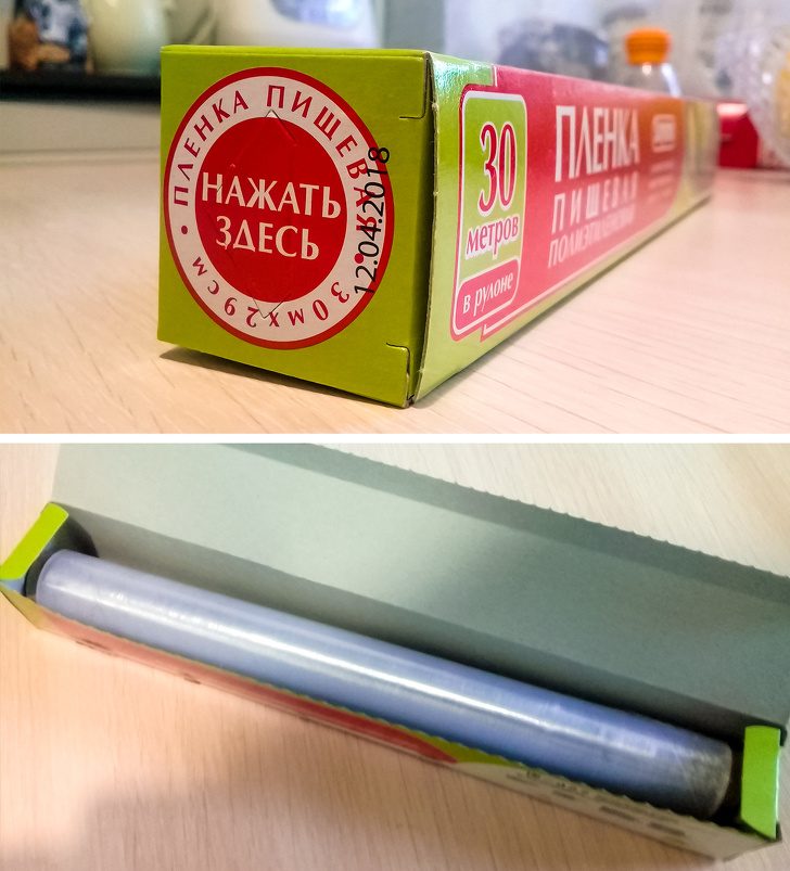 На торцах упаковки фольги или пищевой пленки есть клапаны. Производители придумали их для нашего удобства. Если вы надавите на клапан, то рулон будет надежно зафиксирован внутри коробки и отмотать нужное количество пленки станет гораздо легче.