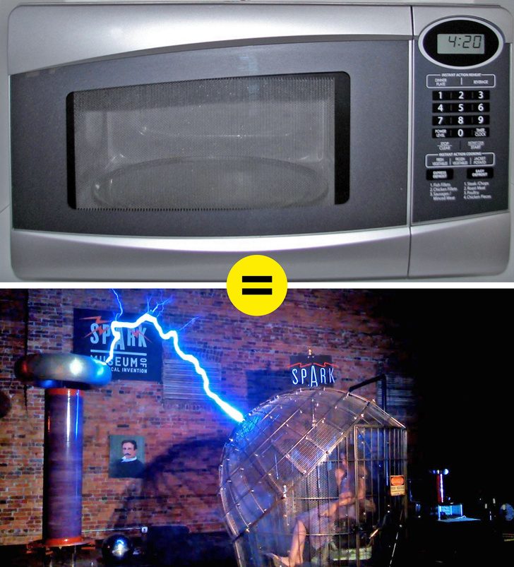 На картинке выше вы видите людей, запертых в клетке Фарадея. Мощный электрический заряд, который бьет снаружи, не причиняет им никаких неудобств (ведь внутрь он проникнуть не может). По этому принципу работает и экран микроволновки: электромагнитному излучению ни за что не вырваться из нее. Поэтому шапочка из фольги вам не понадобится.