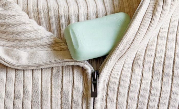 Молния на одежде начала заедать? Самое время задумываться о ее замене. Впрочем, в качестве временной меры сойдет и мыло. Просто проведите им по всей длине молнии. Оно улучшит скольжение и предотвратит разрыв одежды.