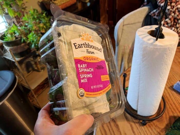 Перед приготовлением салата все ингредиенты нужно тщательно помыть. Если листья салата размокают и превращаются в непонятно что, это легко исправить. Нужно положить их в пластиковую коробку или контейнер, сверху и снизу положив бумажные полотенца. Теперь коробку аккуратно поворачиваем в разные стороны, а когда открываем, получаем чистые и целые листья салата. Быстро, просто и эффективно.
