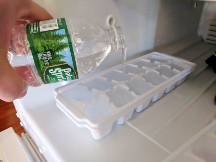 Ох уж эти формочки для заморозки льда… Края маленькие, форма неудобная. Как тут нальешь и донесешь до морозилки не пролив? Любое неверное движение, дуновение ветра или нервный тик, и вода будет повсюду. Везет тем, у кого есть холодильник, автоматически распределяющий лед. Остальным людям приходится довольствоваться простым советом. Наливать воду нужно непосредственно в морозильной камере, а для удобства и аккуратности делать это из бутылки. Тогда вода равномерно распределится, и переносить ее не нужно.