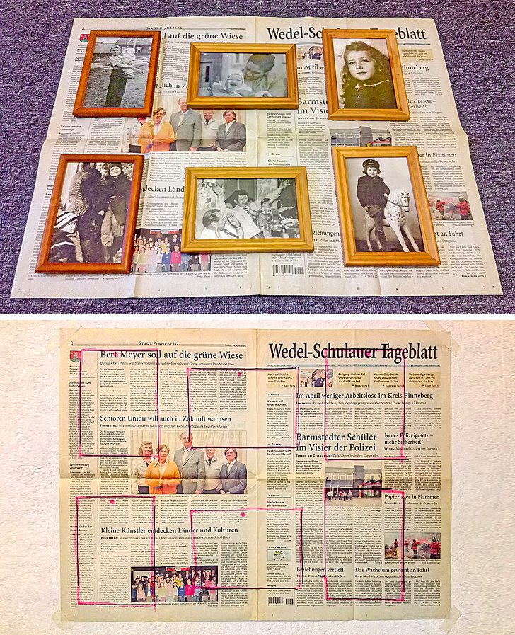 Чтобы обойтись минимумом отверстий в стене, составляя композицию из фотографий или картин, вначале разложите рамки на листе газеты. Обведите границы рамок маркером и отметьте места для шурупов. Потом прикрепите бумажный шаблон на стену и уже через него сверлите отверстия для креплений в стене.