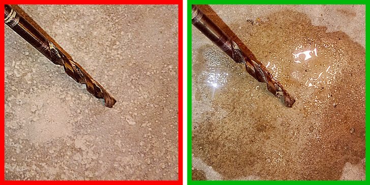 Сверлить отверстия в бетоне будет проще, а пыли будет меньше, если время от времени обрызгивать поверхность водой из пульверизатора.Легкое сверление