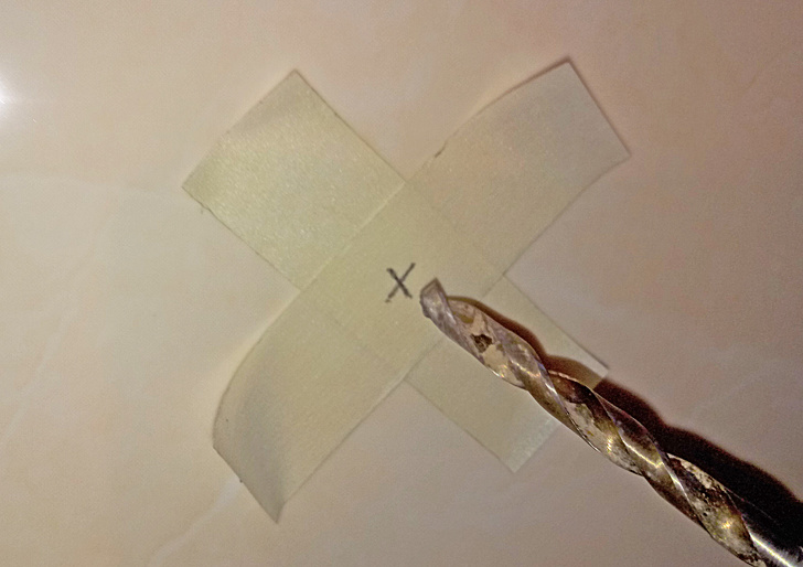 Чтобы при сверлении отверстия в кафеле сверло в начале работы не соскальзывало, наклейте на плитку крест из малярного скотча.