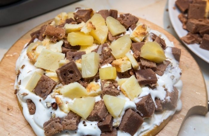 Если хочется «полноценный» торт, то середину можно наполнить кремом и фруктами. Так торт получится с изюминкой и заслужит высшую похвалу от гостей.