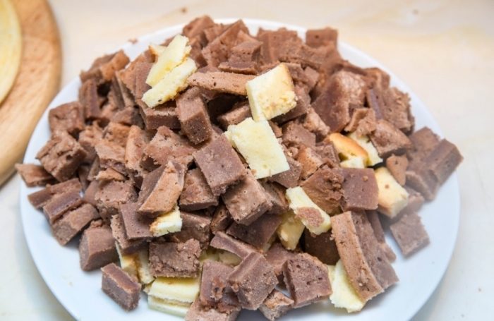 Если корж оказался уж слишком сухим, то попробуйте приготовить торт наподобие магазинного «Везувия». Для этого нарежьте бисквит кусочками, выложите горкой, пропитывая слои сметанным кремом. Сюда же можно добавить фрукты (свежие или консервированные), зефир или кусочки безе. Сверху украсьте шоколадной глазурью, и вкуснейший десерт готов!