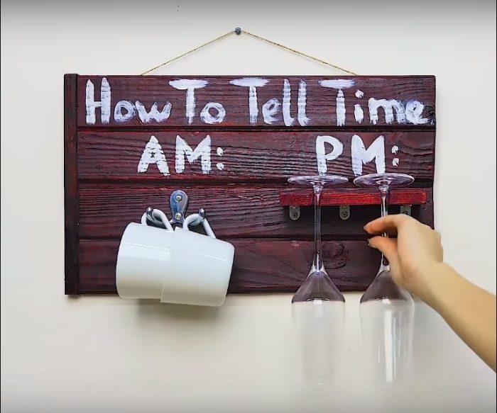 Для создания такого креативного украшения для кухни понадобится всего пару дощечек, краска и несколько крепежных элементов. Соорудить все не составит большого труда, а смотреться будет очень оригинально. Но главное, что в пользовании удобно: утром чай или кофе, а вечером после тяжелого рабочего дня поможет расслабиться бокал вина.
