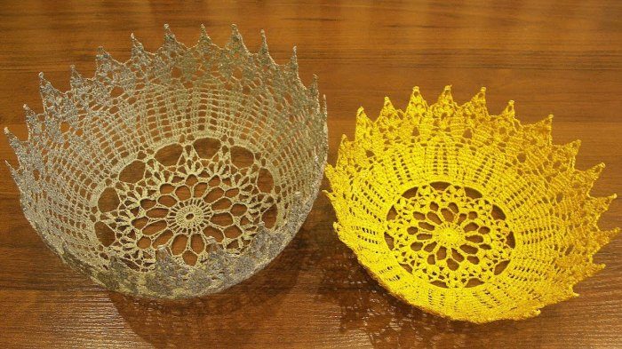 Даже старые салфетки, связанные бабушкой, которые давно валяются где-то в шкафу, можно превратить в современное украшение. На стеклянную или пластиковую посуду с понравившейся формой кладем обычную пищевую пленку, а сверху раскладываем вязаную салфетку. Аккуратно промазываем ее клеем ПВА и даем высохнуть. Теперь разделяем все части, снимаем пленку и наслаждаемся полученной красотой. Салфетка приняла форму, и теперь в нее можно складывать предметы декора или, например, косметику.