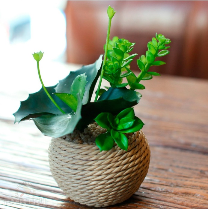 Очень хороши и весьма популярны в последнее время для декора горшки или вазы из веревки. Делать их очень просто: главное взять для основы подходящую тарелку или вазу, а потом постепенно скручивать веревку, параллельно проклеивая ее с помощью горячего пистолета.