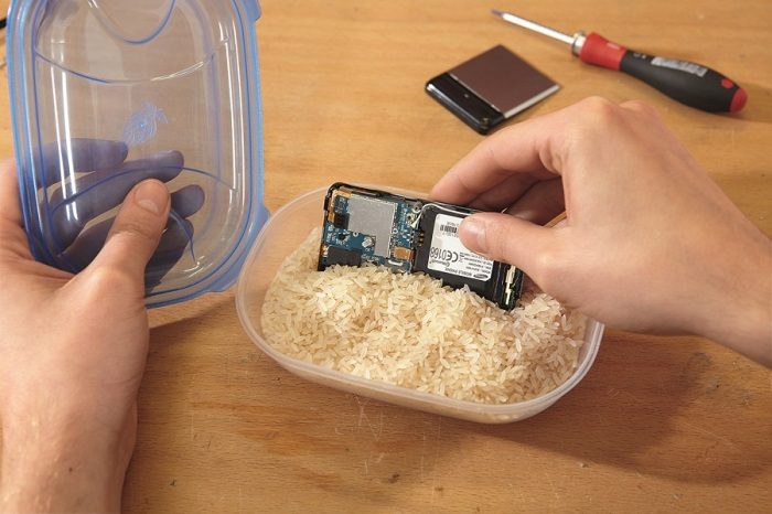 Если смартфон упал в воду, то нужно обратиться в сервисный центр. Когда такой возможности нет, следует снять все съемные детали и просушить его, обернув в бумажные полотенца или положив в рис. При этом гаджет следует класть экраном вверх.