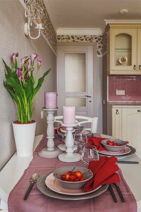 Для отделки кухни использовали испанскую плитку октогональной формы с матовой поверхностью, благородного цвета и оригинальную лепнину на белом потолке. В целом ее оформили в серых тонах с вкраплениями нежно-розовых и сиреневых оттенков, только шторы и плитка выделяются, благодаря насыщенной цветовой гамме.