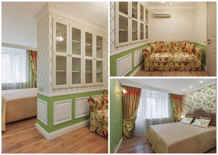— Для организации зонирования единственной комнаты используйте перегородки, стеллажи, шкафы, ширмы или шторы.