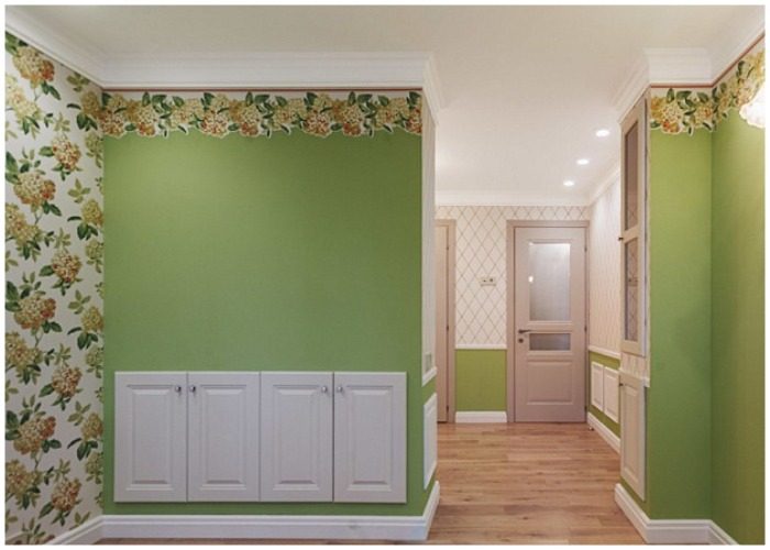 Чтобы создать атмосферу свежести и уюта, выбрали весеннюю цветовую гамму – светлые мягкие тона в сочетании с насыщенным травяным, зеленым цветом и желто-коралловой цветущей гортензией на обоях.