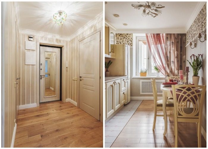 В оформлении гостиной и спальни больше присутствует классических элементов французского стиля – интересные карнизы, массивные двусторонние шторы, цветочные мотивы на обоях, лепнина, вставки на панелях и фактурный диван.