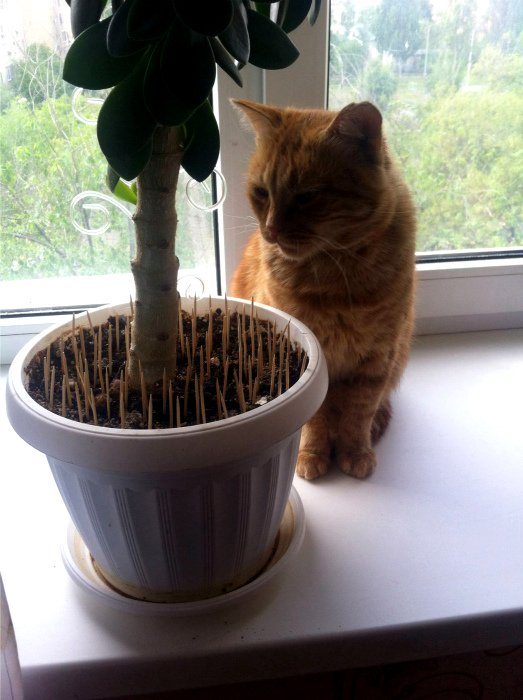 Наверняка, многие владельцы котов сталкиваются с проблемой вредительства по отношению к комнатным растениям. Чтобы ваш питомец впредь не лазил по горшкам и уж тем более не умостил свою тушу на цветок, воткните в землю, как можно больше зубочисток.