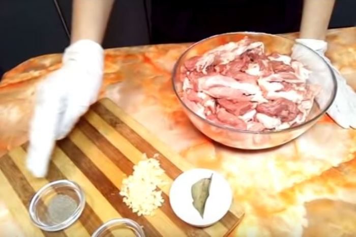 Хорошо моем мясо в холодной воде. Обсушиваем, после чего нарезаем пластинами. Каждая пластинка должна быть толщиной в 1 см, после чего пластинку шинкуем на полоски. Их укладываем в миску для мариновки. Не забываем про соль, специи и чеснок. Они придадут мясу нужный аромат. Измельчаем приправы тщательно. Элементы маринада следует располагать поверх мясной нарезки. Перемешивается масса руками.