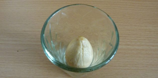 Расположите косточку так, чтобы тупой конец был в воде. Зубочистки, опирающиеся на края ёмкости, не дадут ей утонуть.