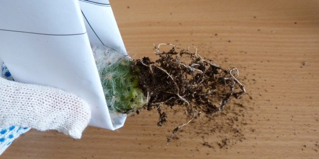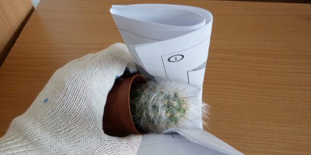Перед пересадкой наденьте перчатки. А кактус берите с помощью прихватки из плотного картона, сложенной газеты, пенопласта или поролона.