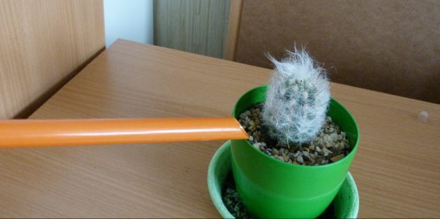 Аккуратно и медленно наливайте воду в горшок, чтобы земля пропиталась постепенно. Старайтесь не намочить кактус. Иначе влага попадёт в микротрещины на его стебле и начнётся гниение.