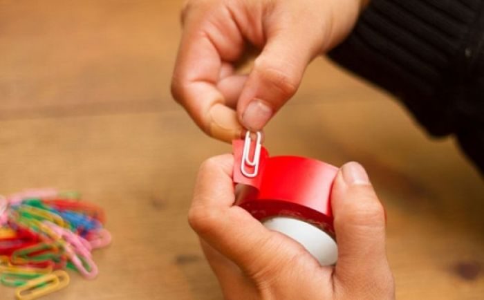 Как это утомительно иногда, искать край скотча или ленты, которые склеился с основным рулоном. Нужно надеть небольшую скрепку на конец ленты. Тогда в следующий раз край можно будет с легкостью найти без лишней траты времени.