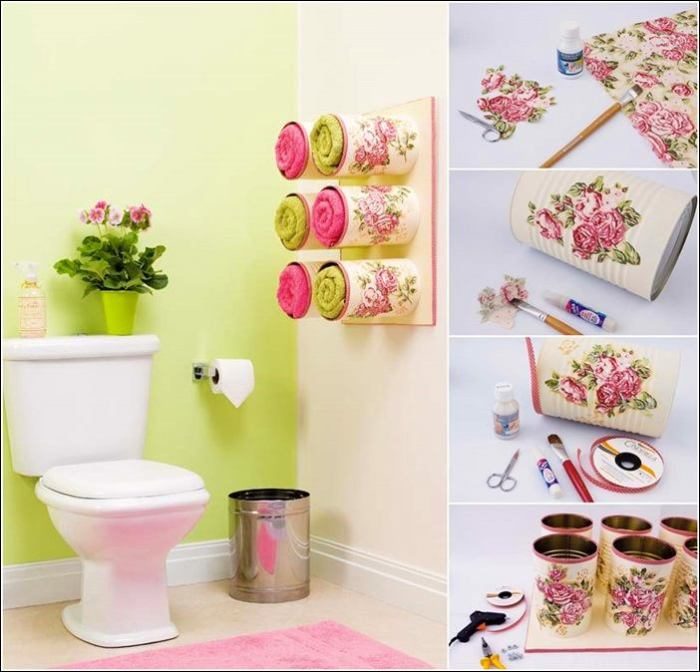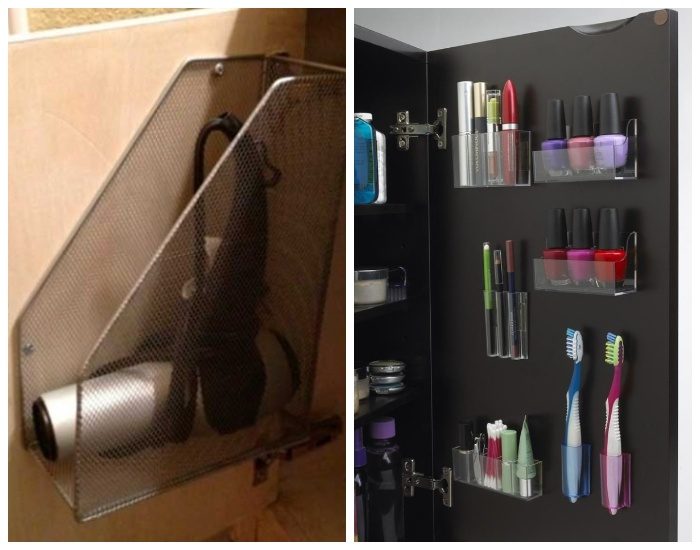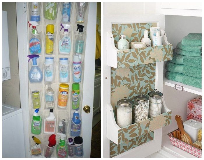 На дверцах же шкафов или тумбы лучше поместить легкие пластиковые ячейки, кармашки, сделанные из цветочных горшков, консервных банок или пластиковых бутылок, всевозможные держатели, в которых сможете хранить как косметику и средства личной гигиены, так и моющие средства или фен с плойкой.