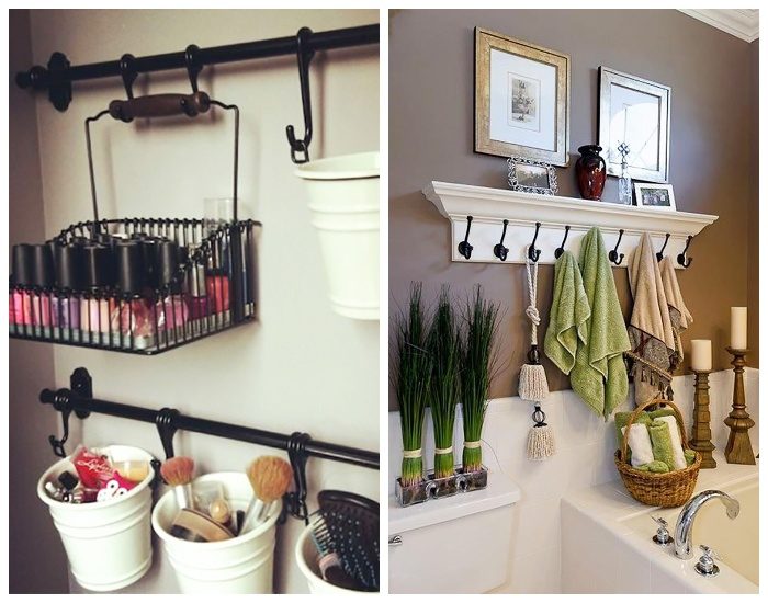 Возле рукомойника можно пристроить небольшие органайзеры на присосках в которых удобно хранить мелкие вещицы и предметы, пользующиеся ежедневным спросом. Или сделать своими руками держатели как для полотенец, так и для всевозможных косметических принадлежностей.