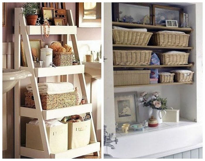 Если под умывальником нет мебельной закрытой тумбы, то пространство под ним можно занять открытыми полочками, а все мелкие предметы лучше поместить в пластиковые контейнеры, решетчатые ящики или обычные плетеные корзинки.