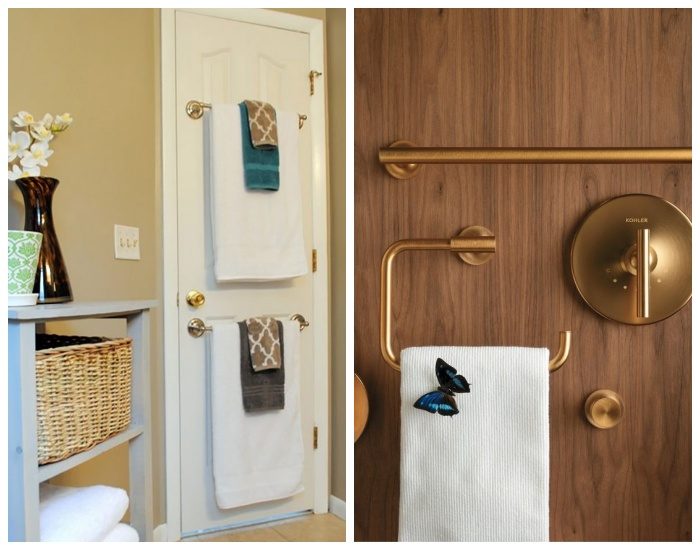 На входную дверь ванной можно закрепить полотенцедержатели, крючки, узкие полочки, клеенчатые или тканевые карманчики (сделайте их своими руками), которые помогут вам пристроить немалое количество вещей и предметов.