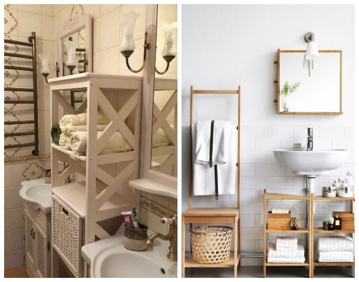 На их открытые полочки можете сложить все что угодно, начиная с объемных банных полотенец, которые всегда занимают много места, и заканчивая моющими средствами.