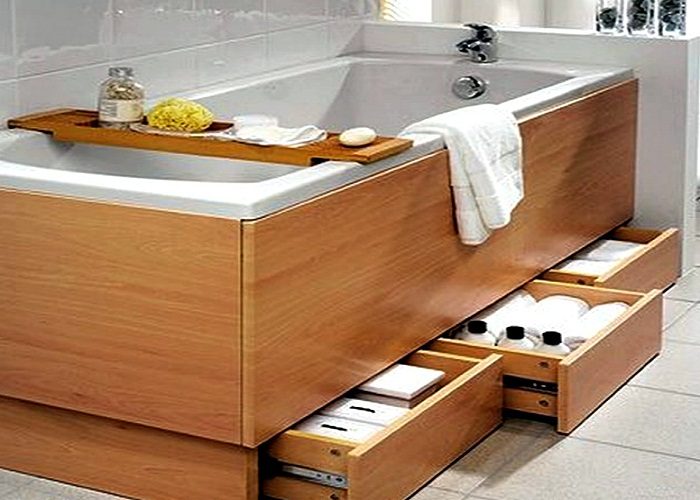 Откидные ящики под ванной позволят иметь все банные принадлежности под рукой.