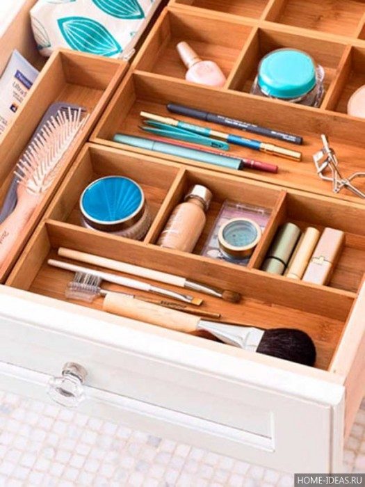 Многие тумбы оснащены выдвижными ящиками, в которых очень неудобно хранить большое количество небольших предметов, поэтому в них лучше установить специальные перегородки, ведь они смогут обеспечить каждый пузырек индивидуальной ячейкой. Благодаря такому нехитрому приспособлению порядок в любом ящике или контейнере будет гарантирован.