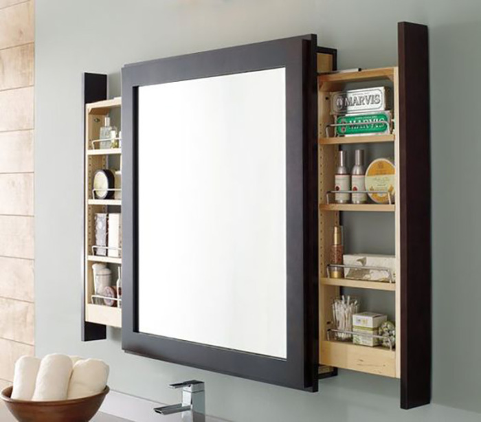 Скрытые системы хранения как нельзя лучше справляются с разумным хранением зубных щеток, пасты, различных тюбиков кремов и мазей, флаконов с духами и туалетной водой, косметических средств и медикаментов.