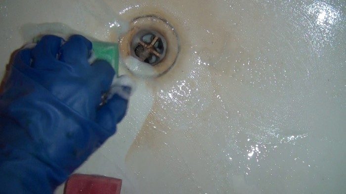 Берем пять таблеток аспирина, основательно измельчаем. Добавляем получившийся порошок в моющее средство для сантехники, после чего тщательно перемешиваем. Теперь состав можно наносить на проблемные места в ванной или туалете. После нанесения следует оставить субстанцию на несколько минут в покое, а затем смыть холодной водой.