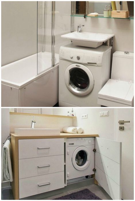 Современному человеку не обойтись без стиральной машины, но иногда вопрос ее размещения становиться настоящей проблемой. В крошечной хрущевке стиральную машинку можно увидеть в коридоре, кухне, кладовке или на балконе. Подобные идеи, конечно, оригинальные, но далеко не самые практичные. Лучше хорошо поразмыслить и суметь таки вместить машинку в санузел. Ее можно разместить под навесной раковиной или спрятать в один из шкафчиков.