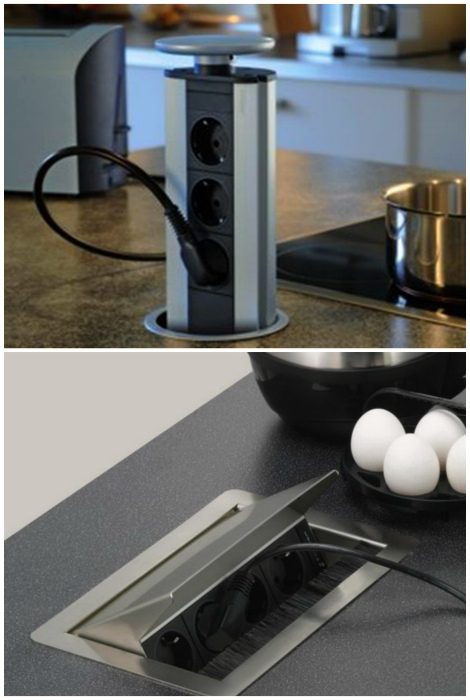 Встроенные розетки и удлинители — идеальное решение для тех, кто не сумел вовремя грамотно спланировать размещение электроприборов на своей кухни. Современные устройства совсем не привлекают внимания и абсолютно не занимают места.