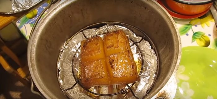 Сверху на фольгу нужно положить решетку. Ее можно купить в любом хозяйственном магазине. Сало нужно порезать на небольшие кусочки или просто надрезать до шкурки. Теперь укладываем его на решетку шкуркой вниз. Сверху котелок закрываем крышкой, которая соответствует по размеру — так, чтобы не оставалось просветов по бокам. Но предварительно нижнюю часть крышки нужно замотать в фольгу. Так все щели будут хорошо закрыты, и в квартиру не попадет дым и лишние запахи. Конечно слабый аромат все равно будет распространяться по кухне, но он скорее приятный и не причинит неудобств. Поможет заранее подогреть аппетит.