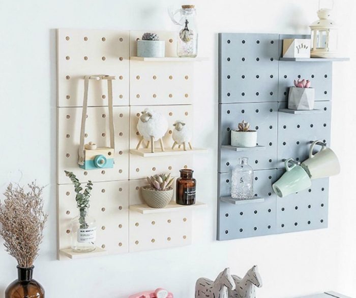 Доски-пегборды из дерева — это оригинальные и весьма практичные системы для хранения любых вещей. Перфорированные панели с одинаковым успехом можно использовать для хранения кухонных принадлежностей, аксессуаров, головных уборов и канцтоваров.
