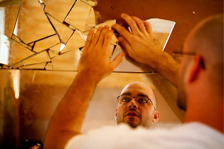 Рабочий Том МакКинни приклеивает кусочки зеркала к стене.
