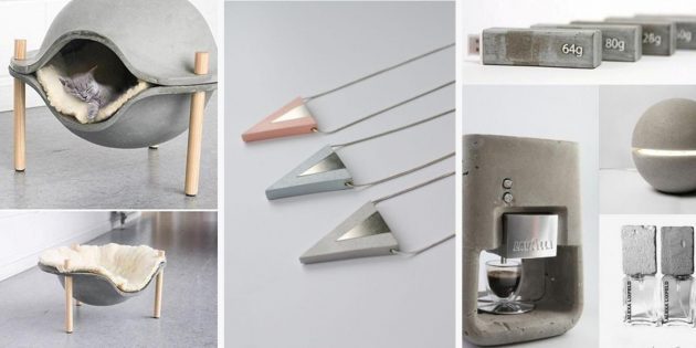 Особого упоминания заслуживают интерьерные аксессуары. Благодаря лёгкости изготовления их ассортимент очень разнообразен: от держателей для мобильных телефонов до светильников, от часов до цветочных кашпо. Возможности ограничены только полётом фантазии.В Сети можно подсмотреть блестящие идеи бетонных аксессуаров для дома и сада и легко их повторить. Китайские производители уловили тенденцию и продают в онлайн-магазинах многоразовые формы для изготовления аксессуаров из бетона.