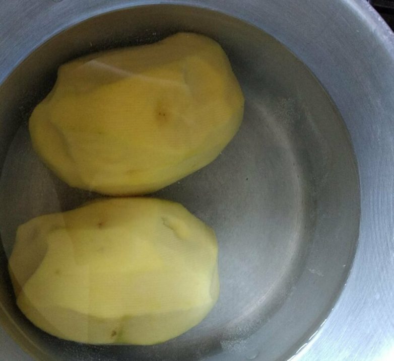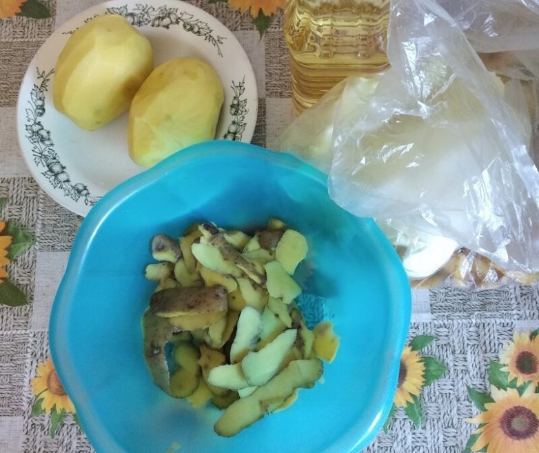 Тем временем чистим картошечку и отвариваем оную. Очистки и гнилушки не выбрасываем. Убираем их в пакетик и отправляем в холодильник. Чуть позже из них мы приготовим торт Панчо.
