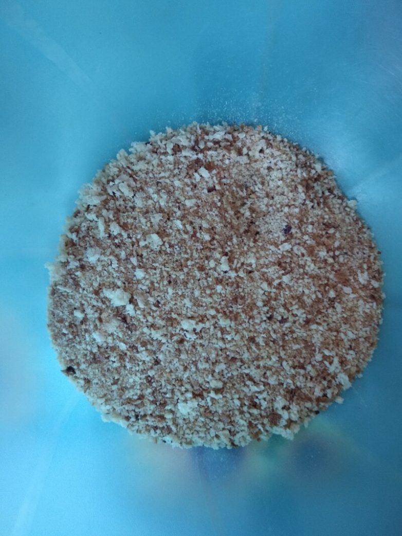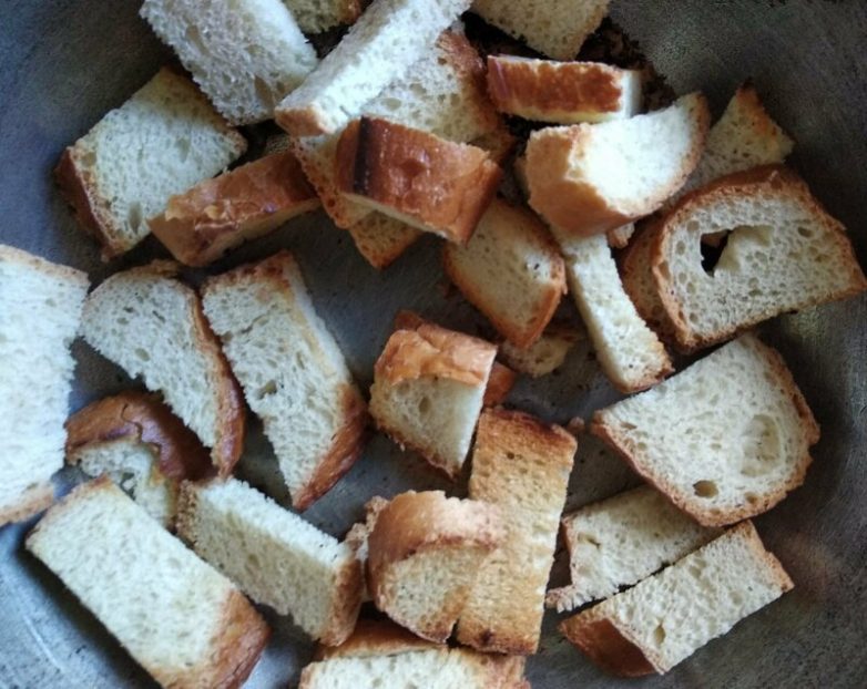 Панировочных сухарей у меня не было, но в холодильнике лежал плесневелый батон. Я его нарезал и отправил подсушиваться на медленном огне.