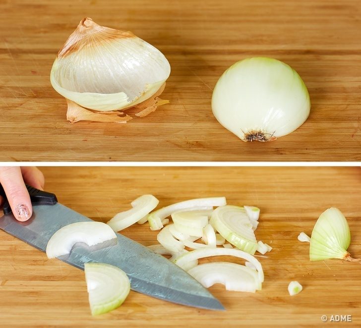 Иногда кожура слишком плотно прилипает к луковице. Чтобы не возиться и не очищать ее ножом, просто снимите верхний слой вместе с кожурой. Мы попробовали, это и правда работает.Не срезайте «хвостик» луковицы: за него очень удобно держаться во время нарезки. Ну а потом его можно просто выбросить.