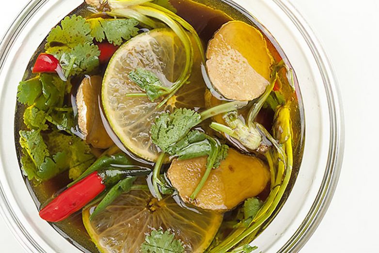 1. Смешайте соевый соус с соусом терияки. Лайм разрежьте пополам и выжмите сок в смесь соусов. Крупно порубите кинзу и, если используете, перец чили и добавьте в маринад. Туда же киньте тертый или тонко нарезанный имбирь.