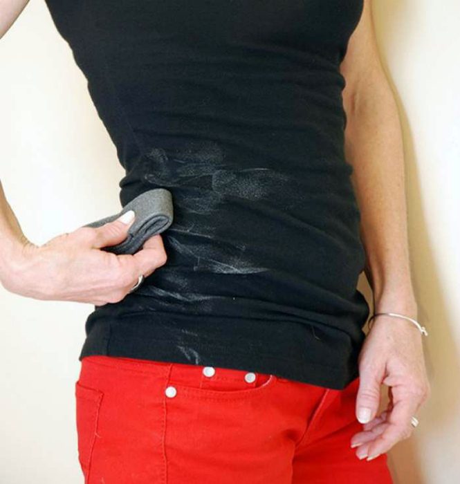 Белые пятна на дезодоранта имеют свойство появляться не только под мышками и очень бросаются в глаза на черных вещах. Однако, если вы протрете ткань влажными салфетками, от пятен не останется и следа.
