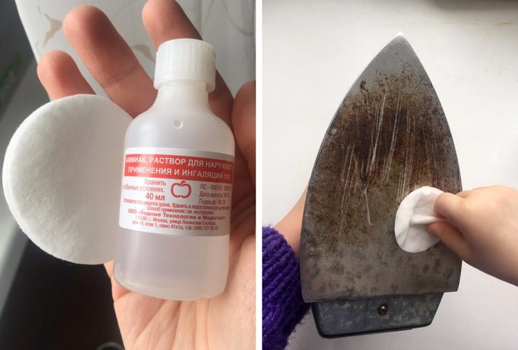 Убирает загрязнения с подошвы утюга. Если когда-то вы подпортили утюг и «приклеили» к его подошве частички ткани, воспользуйтесь раствором воды и нашатыря. Смочите в нем ватный диск и обработайте поверхность. Если загрязнения остаются, попробуйте смешать 1 ч. л. нашатыря с 1 ч. л. уксуса и снова обработать подошву.