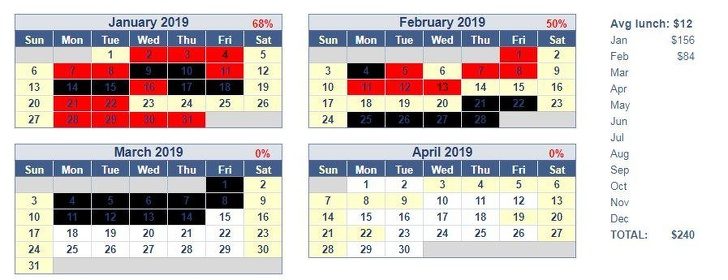 Чтобы было легче отказаться от покупки бизнес-ланчей, отмечайте в календаре те дни, когда вы принесли обед из дома (черная отметка) и купили его в кафе (красная отметка). Эта маленькая хитрость не только мотивирует, но и наглядно покажет, сколько вы сэкономили в месяц.
