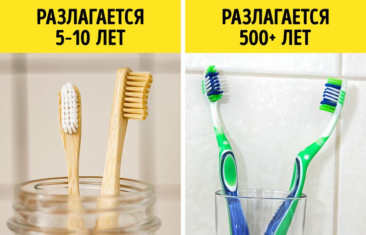 Замените обычную зубную щетку из пластика на бамбуковую или на щетку из переработанного пластика
