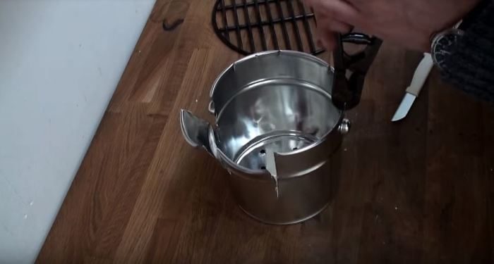 Итак, прежде всего делаем отверстия для воздуха. Для этого берем отвертку, молоток и пробиваем в дне ведра несколько отверстий (жалеть места не стоит). Когда это будет сделано, вооружаемся ножницами по металлу и надкусываем грани ведра в верхней части, в нескольких местах по кругу так, чтобы полученные «лепестки» можно было согнуть, и в итоге получилась своего рода «ромашка».