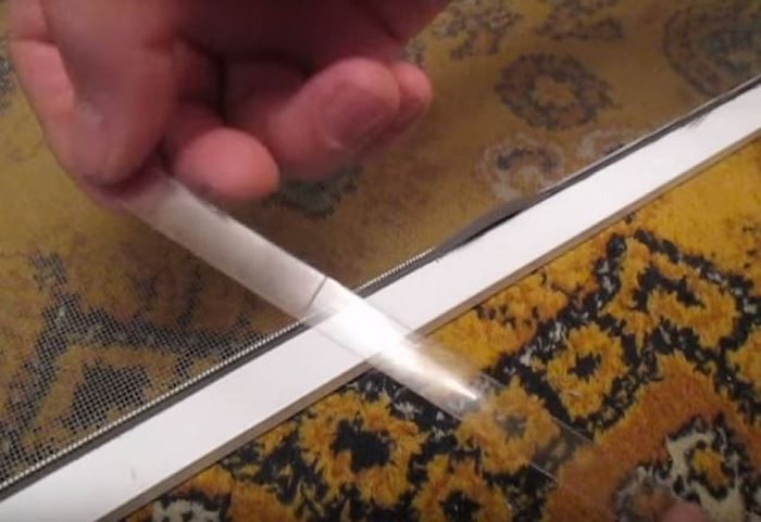 Когда все готово, снимаем москитную сетку с окна (если она уже была установлена) и кладем ее на ровную поверхность.